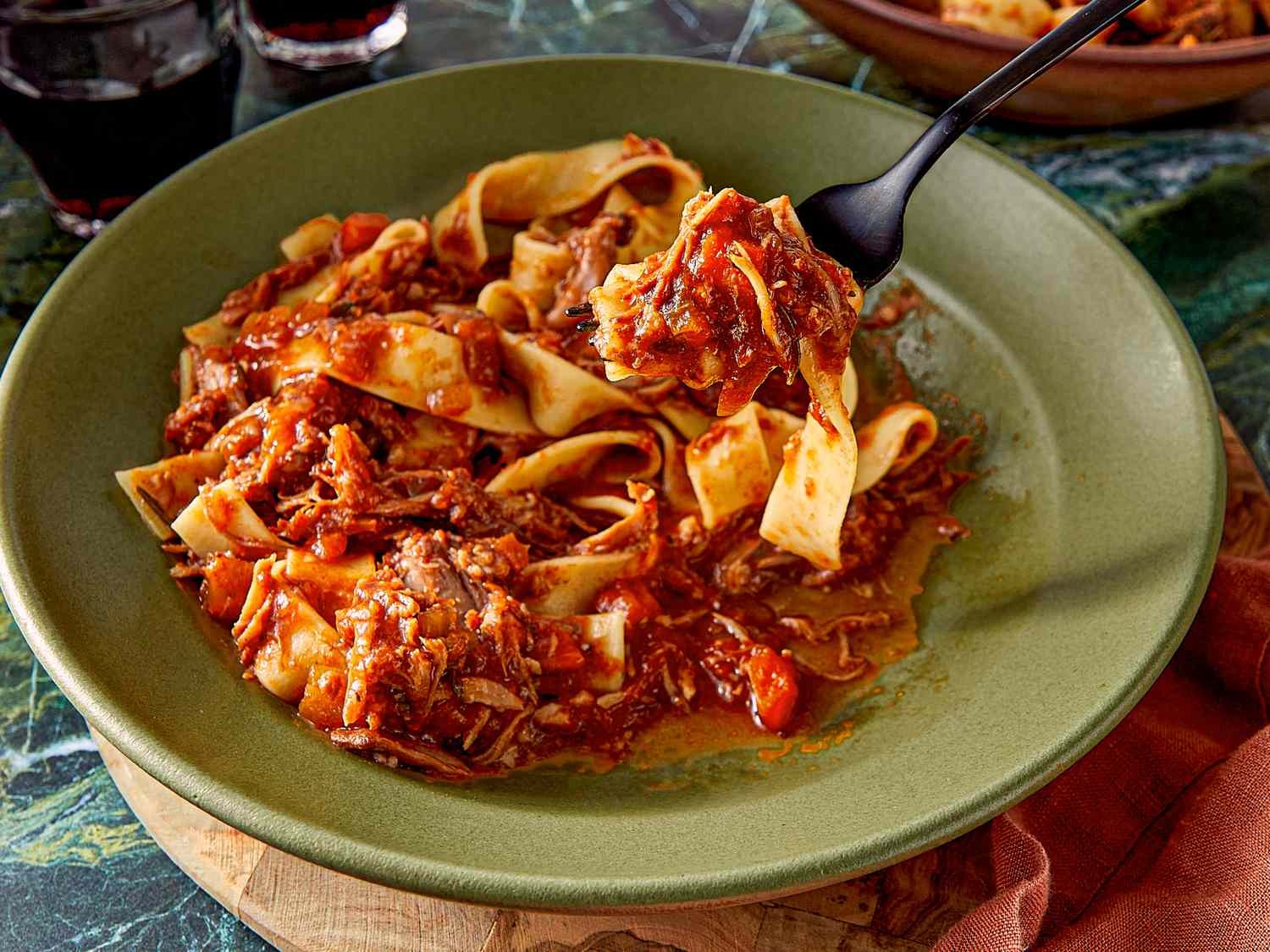 Після повільного приготування свинина повинна легко розпадатися виделкою. Видаляють кістки і гілочки трав, потім за допомогою картопледавки м’ясо подрібнюють прямо в мультиварці, забезпечуючи рівномірний розподіл по всьому соусу. Ідеально підходить широка локшина, наприклад паппарделле, яка забезпечує достатню площу поверхні для прилипання рагу. У результаті виходить страва з ідеальним покриттям, приємно ситна, без нальоту на дні тарілки.